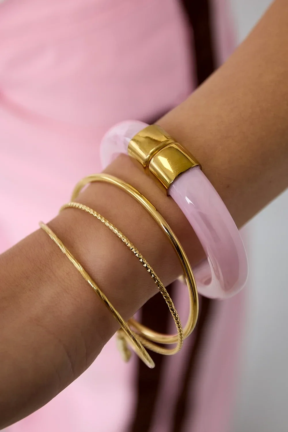 Voeg een verfijnde touch toe aan je look met deze moderne armband. Het zachte, lichtblauwe materiaal heeft een subtiele marmerachtige uitstraling die rust en luxe uitstraalt. De glanzende gouden details zorgen voor een chique contrast en geven het geheel een tijdloze, elegante finish.